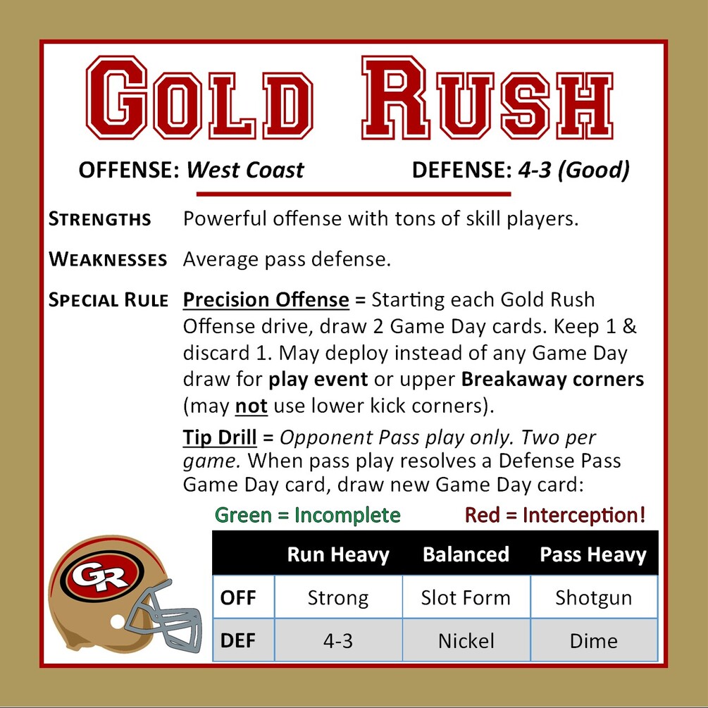 Gold Rush - Inspired by the 2023 San Francisco 49ers, the team that lost Super Bowl LVIII in overtime to the Kansas City Chiefs, the Gold Rush feature a high-octane Offense playbook and an opportunistic pass defense.