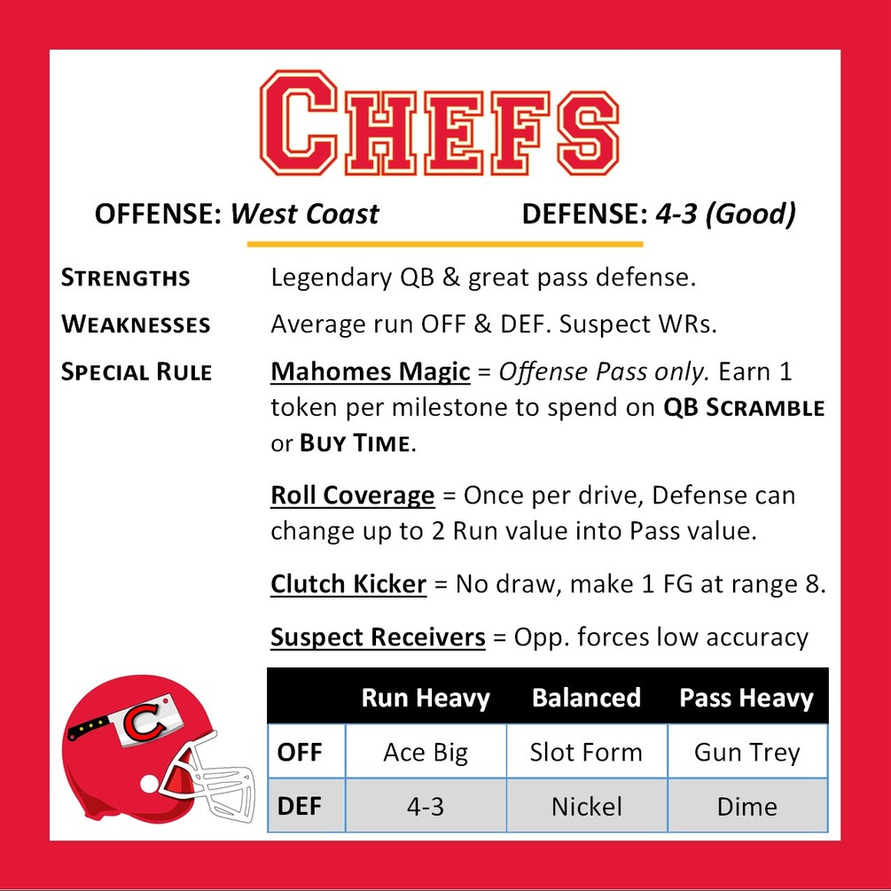 Chefs - Inspired by the 2023 Kansas City Chiefs, the team that won Super Bowl LVIII in overtime over the San Francisco 49ers, the Chefs feature a legendary QB in Patrick Mahomes who can carry the offense on his back to move the football in critical moments.