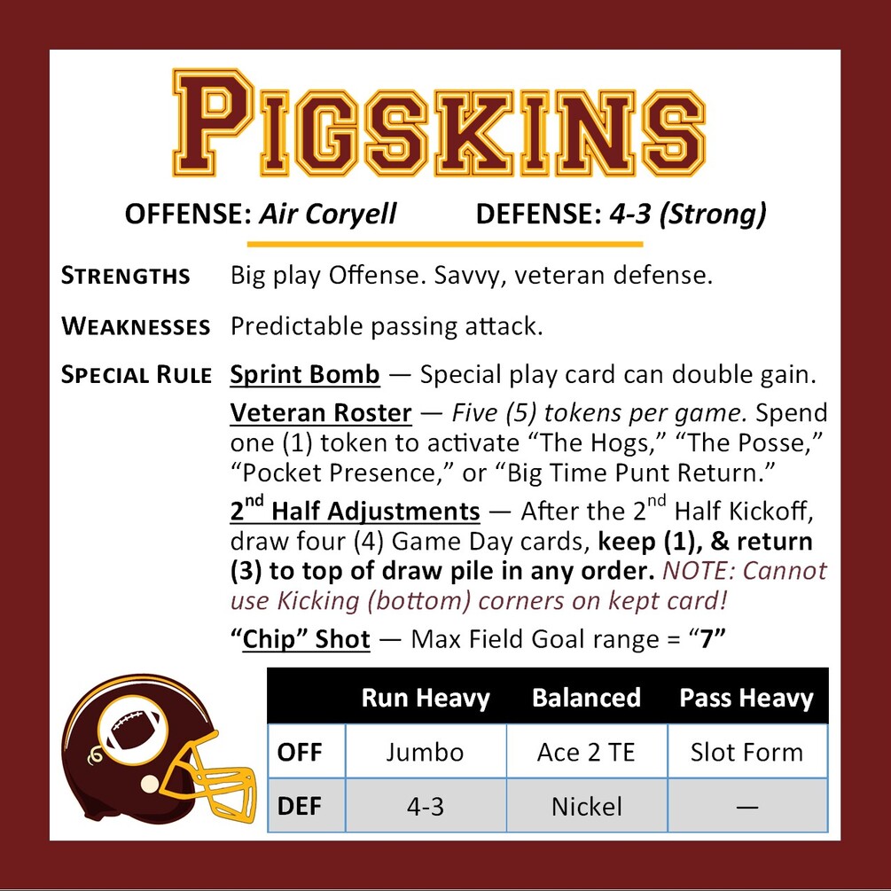 Pigskins - Inspired by the 1991 Washington Super Bowl champs, the Pigskins feature a savvy, veteran roster that wears down their opponent with consistent, error-free football. Their deep passing game is exceptional and the balance of their offense is often difficult for opponents to predict. Add in a capable defense with predictive 2nd Half Adjustments and you have a recipe for championship success.