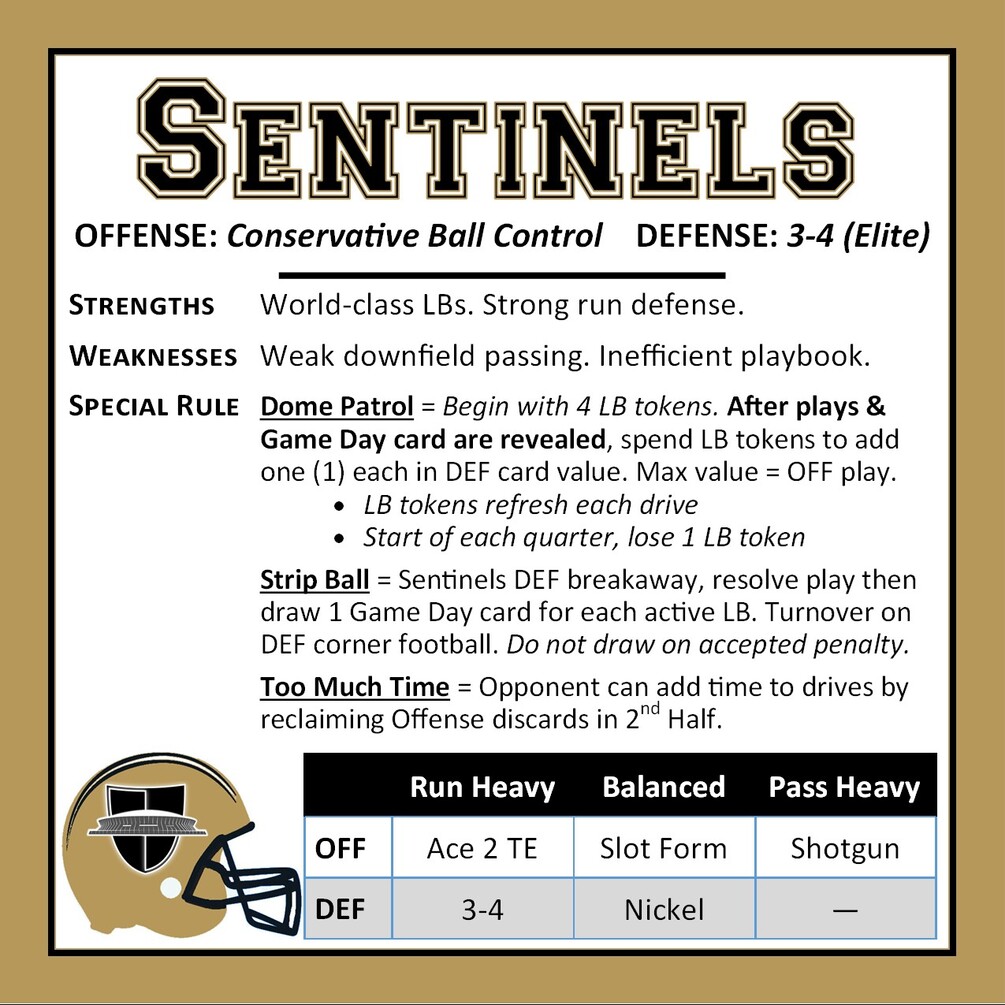 Sentinels - Inspired by the 1991 Saints, the Sentinels feature the iconic "Dome Patrol" linebacking corps, often named the best in pro football history. Their Dome Patrol mechanism allows the linebackers to plug gaps, force turnovers, and grind opponents to a halt. However, the Offense is underwhelming with lower-than-expected card values. Because the Sentinels lose strength on both sides of the ball in the 2nd half, this team offers a compelling challenge for experienced coaches.