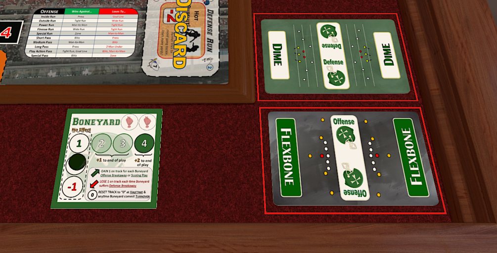 Teams include all components needed to play, including 15 Offense cards per team, up to 10 Defense cards per team, a team-specific mat describing each team's special rules, and any pawns, cubes, or discs needed to play. Each team is separated into their own virtual bag of components, making it easy to setup your game. The base game components of Breakaway Football (game boards, Game Day deck, etc.) are also included. Just follow these instructions to copy the .json file into the proper location on your computer and you are ready to play!